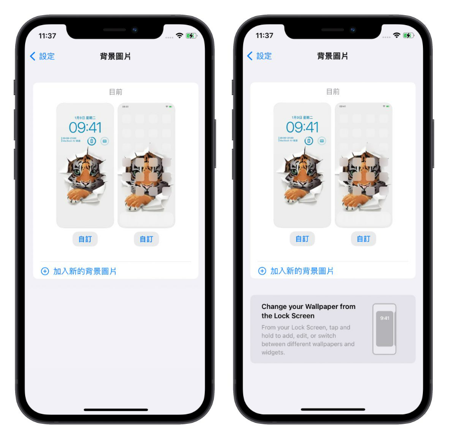 在iOS 16 Beta 3 版本中,如果你想要从「设定」的「背景图片」功能中变换背景图片时,下方多了一个区块提醒你可以从锁定画面的设定中去变更整个锁定画面与主画面的样式。
