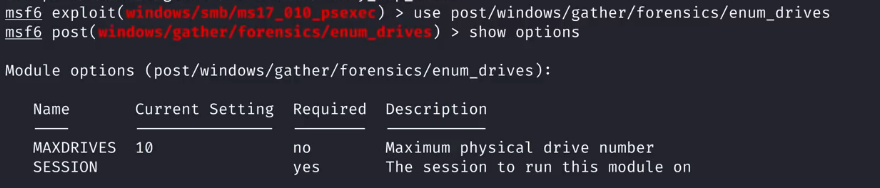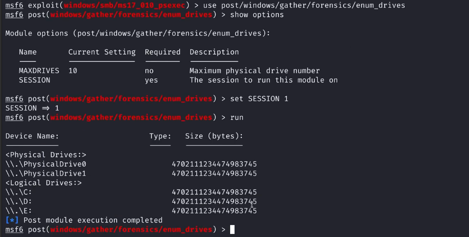 我们将使用post/windows/gather/forensics/enum_drives模块