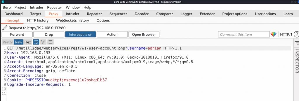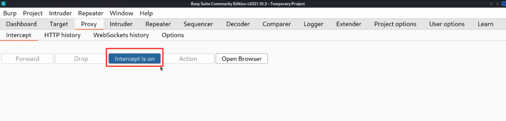 - 打开BurpSuite,开启拦截(Intercept is on显示为蓝色代表打开了)