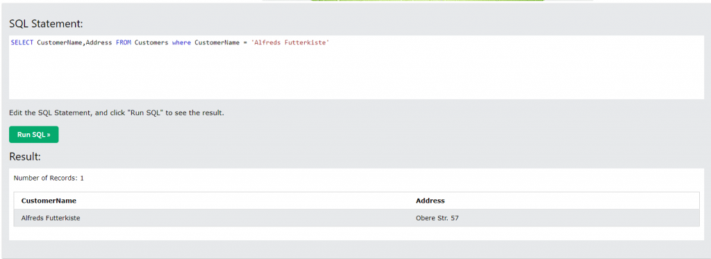SELECT CustomerName,Address FROM Customers where CustomerName = 'Alfreds Futterkiste'