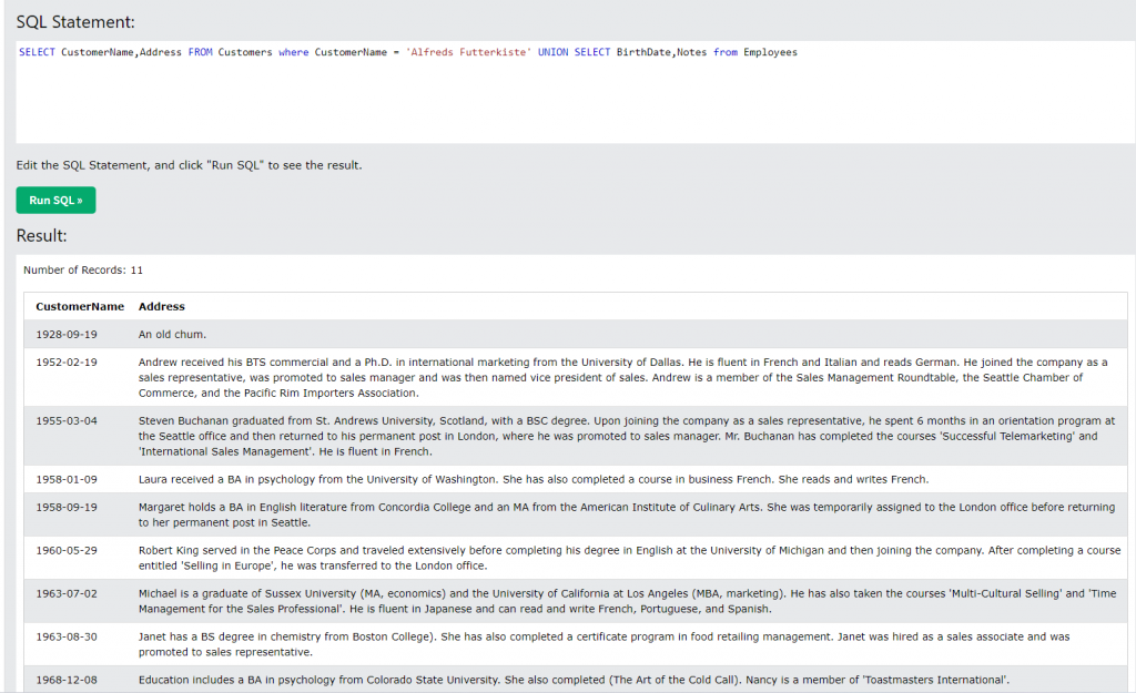 SELECT CustomerName,Address FROM Customers where CustomerName = 'Alfreds Futterkiste' UNION SELECT BirthDate,Notes from Employees