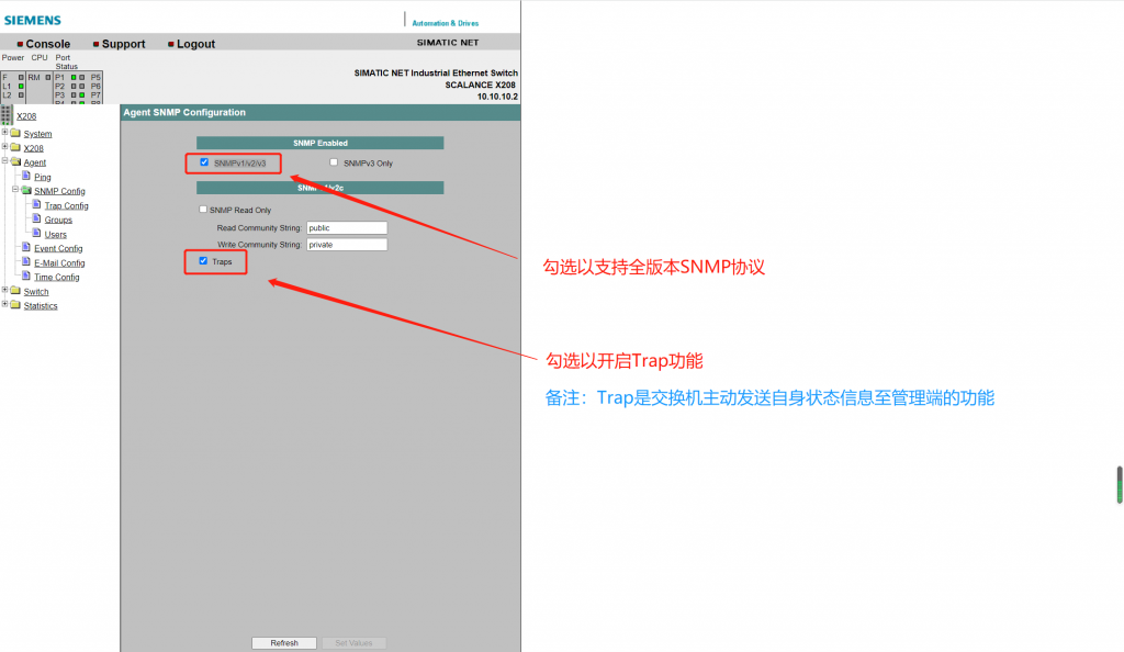 - Agent ==> SNMP Config ==> Trap Config ==>填写管理端IP + 启用