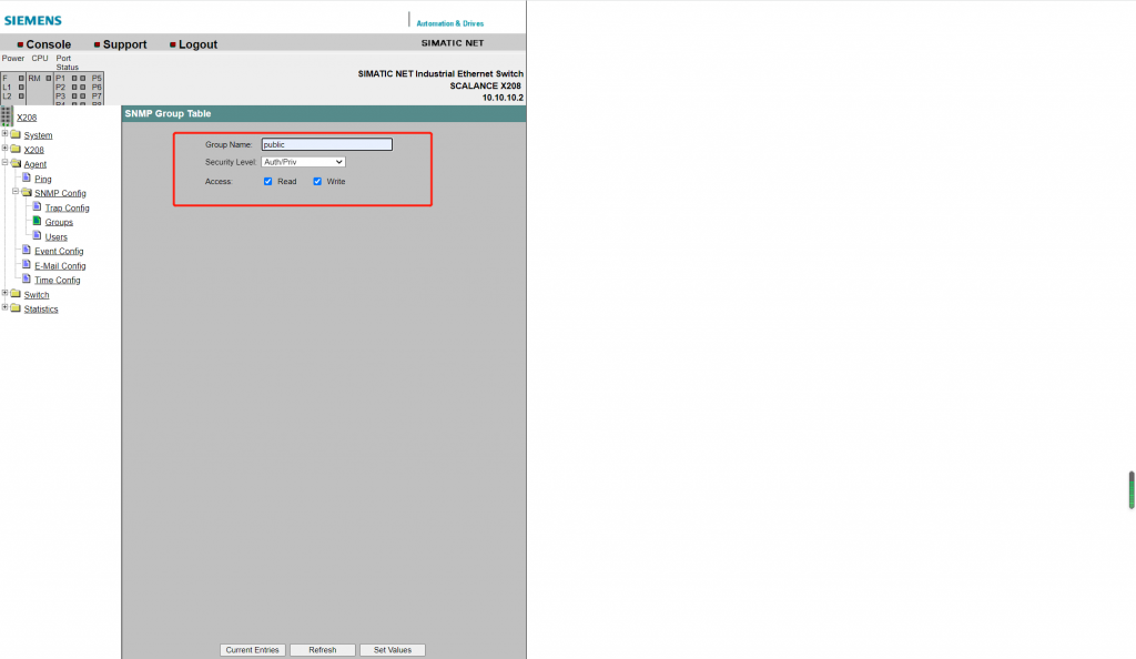 - 配置SNMP用户群组,测试一般使用public作为昵称,赋予读写权限。