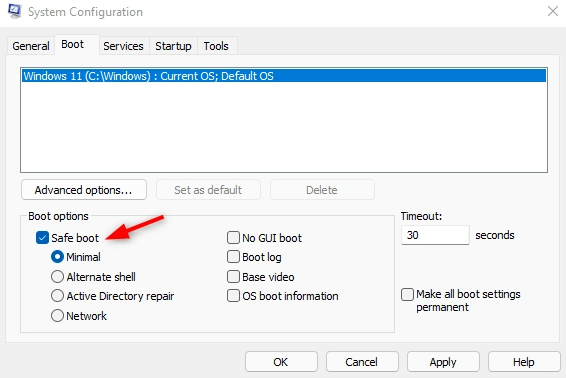 要重新启动到正常版本的Windows 11,我们需要禁用安全启动选项。再次打开MSConfig,删除安全启动选项。
