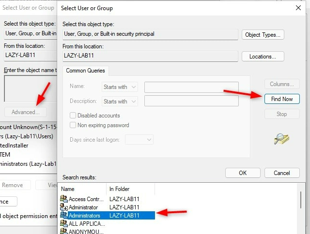 - 点击 "高级">"立即查找 "并选择 "管理员"。