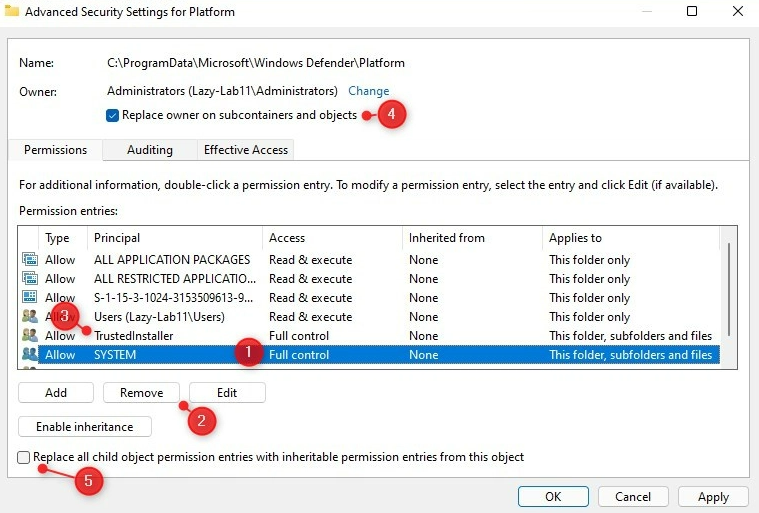 我们现在拥有了Windows Defender应用程序的所有权。我们现在需要做的是,从列表中删除所有的用户/负责人。