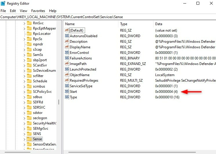 | HKLM\SYSTEM\CurrentControlSet\Services\Sense\Start | 3 |