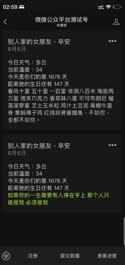 附:当然,如果你有多个女朋友,你可以在微信公众平台上为她们设置不同的模板,并且为每个人分别建立一个配置文件,例如:xiaomei.yaml 和xiaohong.yaml(注意在配置时千万不要写错了user_ids)。然后同时运行两个服务: