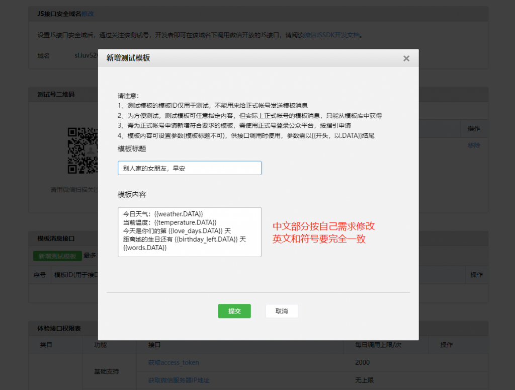 图中的操作,除了各种英文字符串不一样,模板消息中的中文不一样,其他的应该都是一样的,不然程序跑不通的~