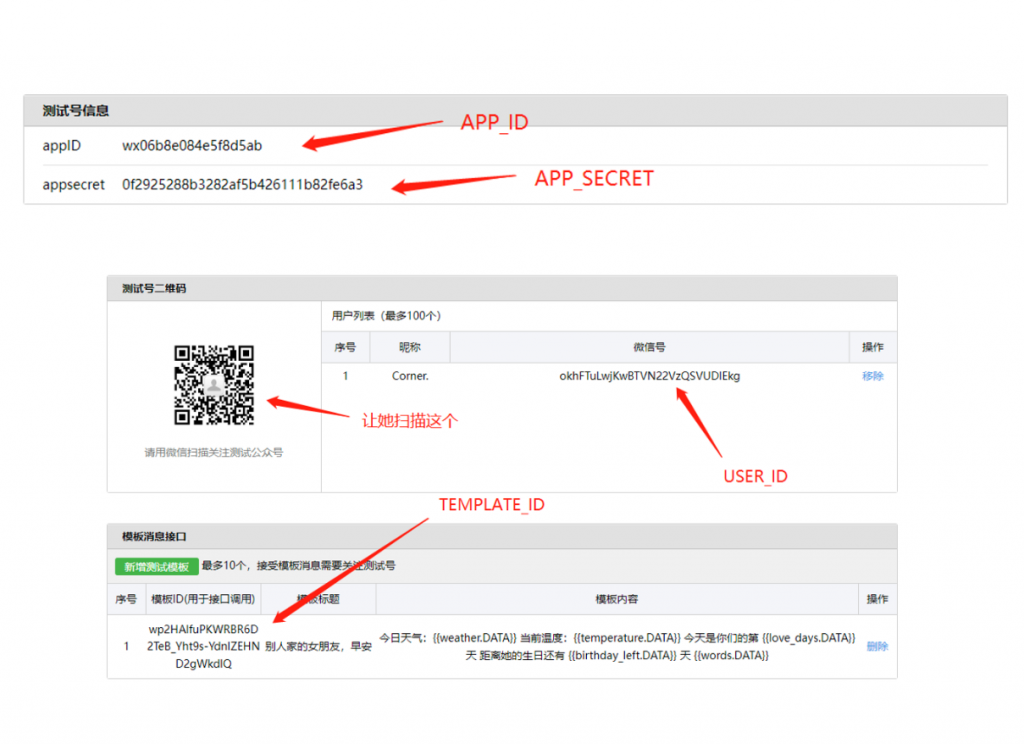 - 第一次登录微信公众平台测试号给的 app secret 是错误的,刷新一下页面即可