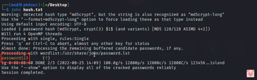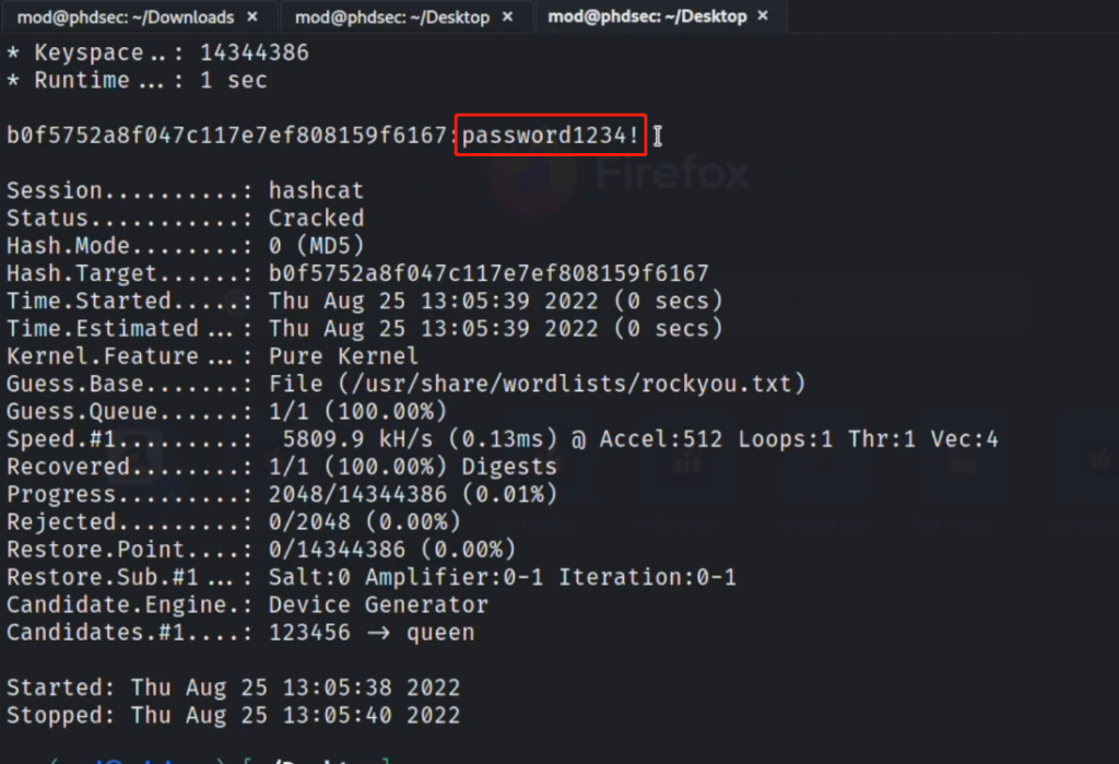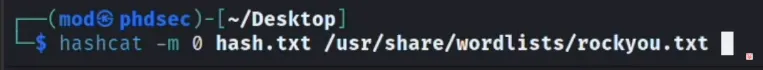 hashcat -m 0 hash.txt /usr/share/wordlist/rockyou.txt