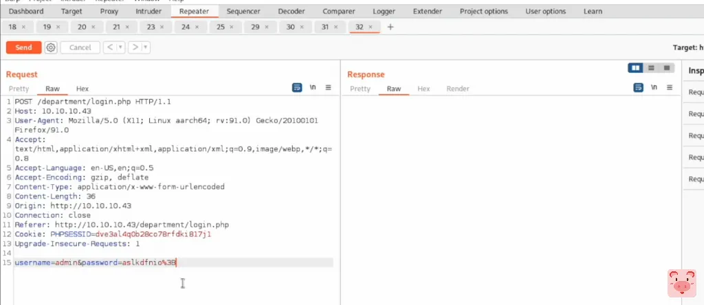 -l代表输入的^USER^值,可以是字典,我们这里指定是admin-P代表输入的^PASS^值,这里选择rockyou.txt字典10.10.10.43是目标服务器的IPhttp-post-form为请求方法POST- 引号中的部分,URL:Payload:Response URL为请求的url地址,Payload为请求体的内容,可以将请求体中的用户名和密码使用^USER^、^PASS^字段替换,Response则是响应体里的内容