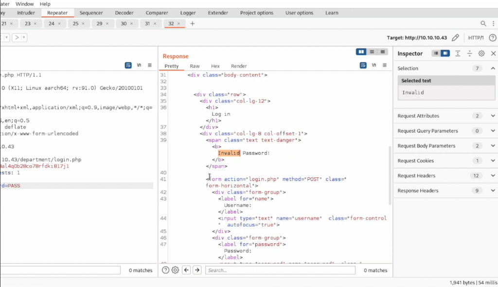然后我们输入密码,查看响应,如果密码错误会显示Invalid,那么如果响应里没有Invalid则可以初步判断,密码可能正确
