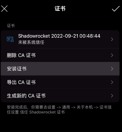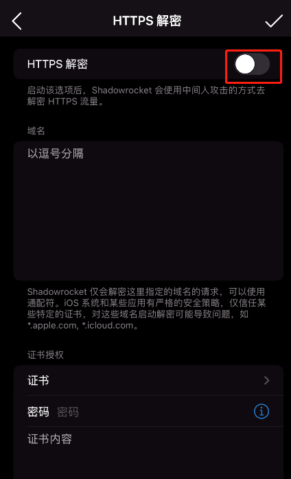 - Shadowrocket安装SSL证书(配置文件>本地文件右侧按钮>HTTPS解密)