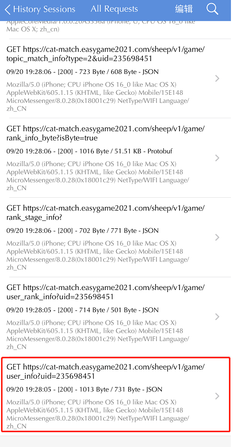 重新打开游戏,点击历史排行榜,然后停止Sniff,在Sniff History里可以看到