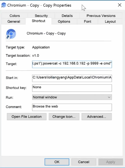 很多热心网友表示,用户通常不会自己打开这些恶意文件,那么也不是没有办法,我们可以将其伪装成一些特定的快捷方式,比方说浏览器