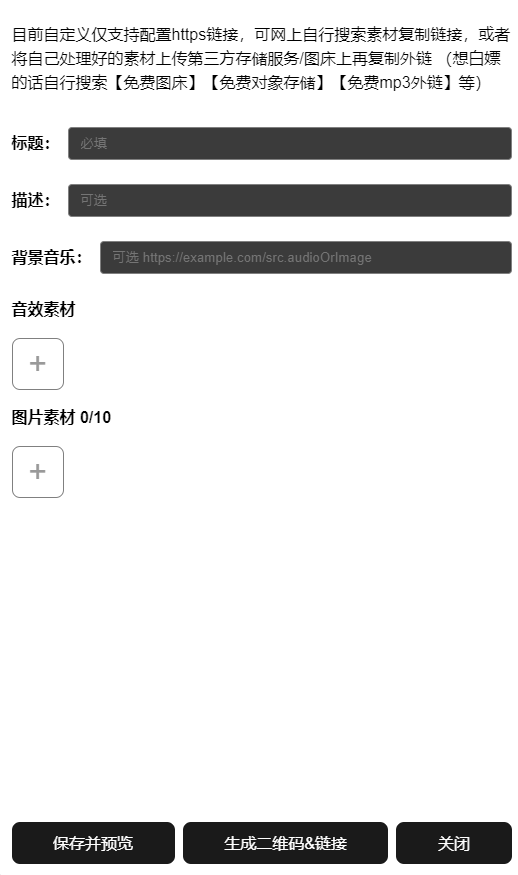 您可以自行添加标题、描述、背景音乐、音效素材、图片素材