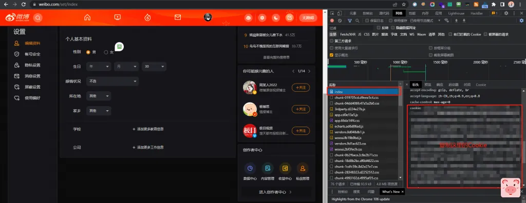 打开微博,F12打开开发者工具,刷新页面,找到index,复制右侧的Cookie内容即可