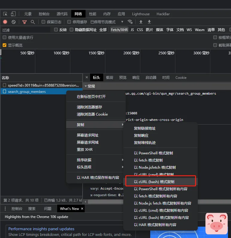 因此,我们可以继续按照刚才的方式,复制>以cURL(bash)格式复制