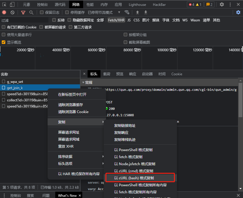 在我们找到的接口中,复制>以cURL(bash)格式复制
