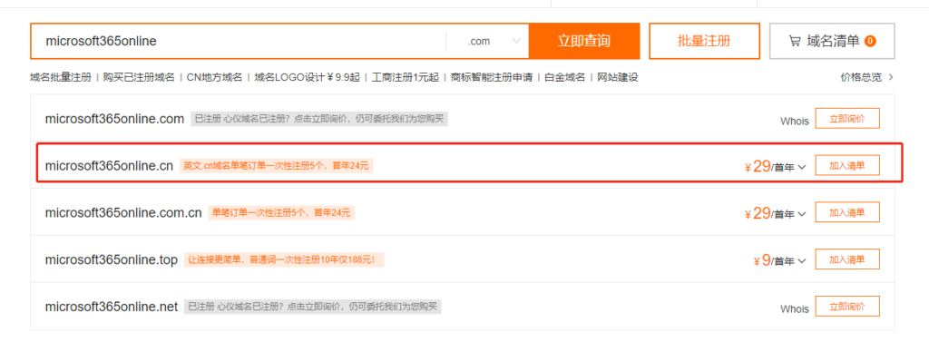 域名您可以在下面的链接中购买,因为这里是钓鱼,模仿Office 365,因此建议买一个带microsoft的域名,会略显真实一些