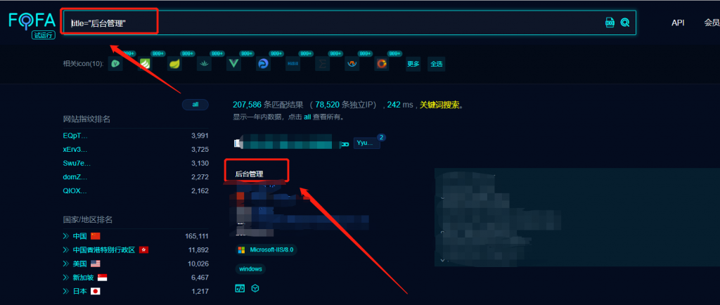 1、搜索页面标题中含有“后台管理”关键词的网站和IP地址