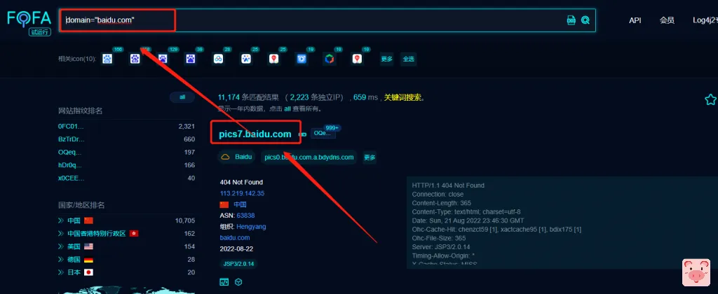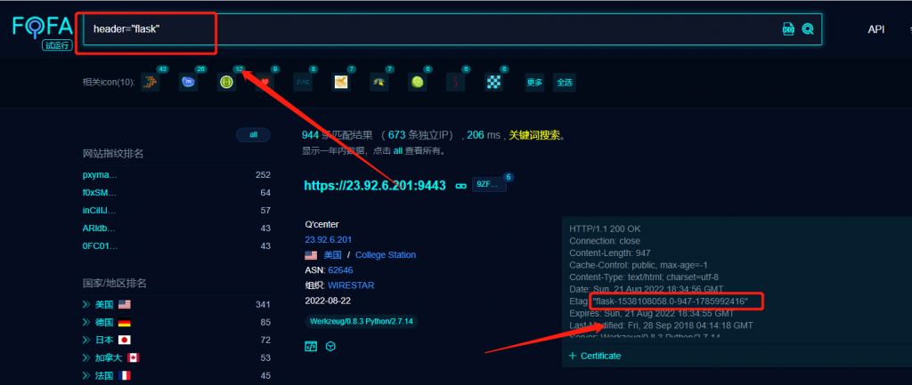 2、搜索HTTP响应头中含有“flask”关键词的网站和IP地址