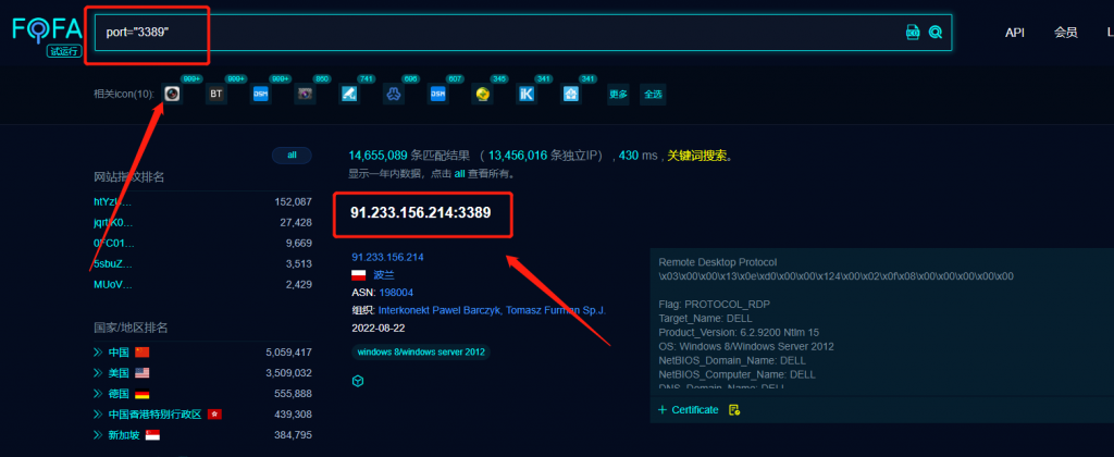 5、搜索开放3389端口的ip