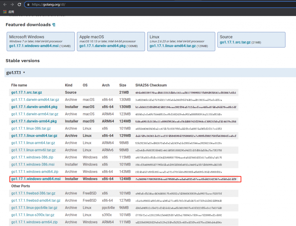 我们这里是windows系统,可以选择go1.17.1.windows-amd64.msi安装器进行下载
