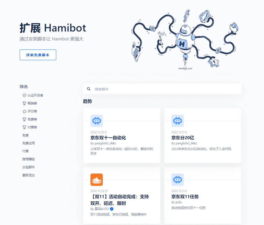 当然还有一部分比较懒的用户,你也可以使用hamibot这样的平台,里面包含了众多脚本