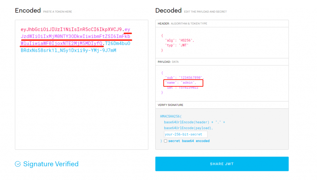 我们会发现在Payload中会包含我们用户身份的信息,比方说name,那么设想一下,有些对安全没有进行足够校验的,是否可以通过修改name后面的名称,进行越权访问呢?譬如,我们将其修改为admin