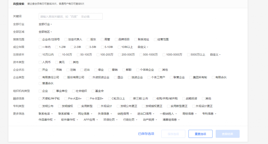 - 支持20+条件选项,同时选择行业、地区、注册资本更多个条件查询公司信息