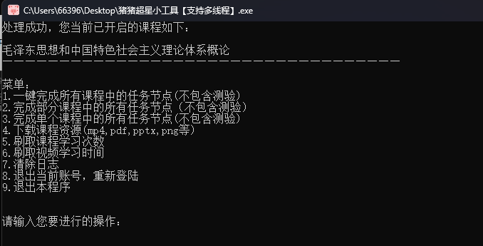 3.在回车-输入账号密码之后进入一下界面,这里你选择, 刷课原理是多线程技术,也就是说,先获取这一科目的所有课程,进行同步刷课,大大节省效率和时间