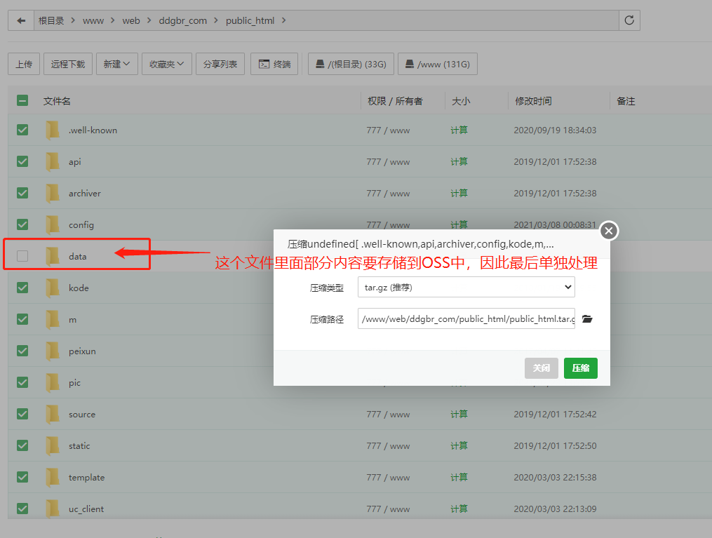上述操作完成之后,进行解压缩,然后我们回到旧的阿里云服务器将刚才data文件里的部分资料进行打包