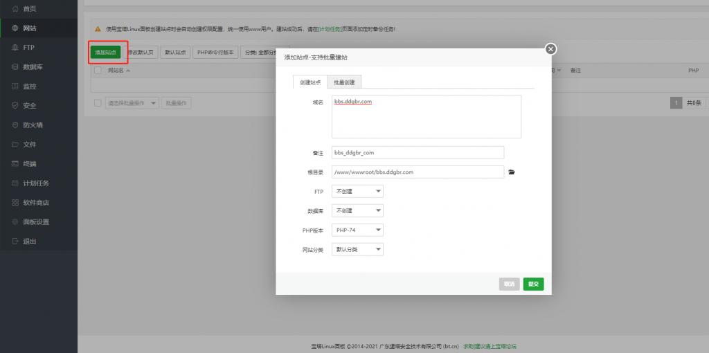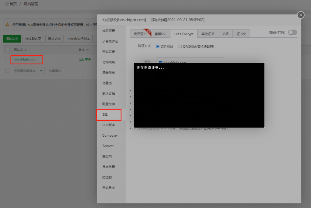 先在网站管理>站点修改>SSL里申请Let's Encrypt的https证书(当然你也可以去腾讯云申请一个1年的SSL证书,这个看个人习惯)