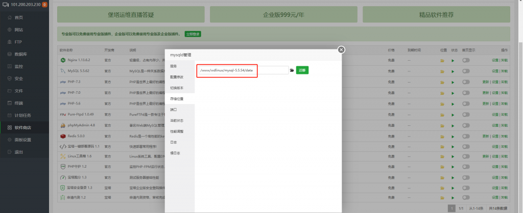 这说明客户存储的数据库位置不是宝塔默认的,我们可以前往软件商店>Mysql设置>存储位置