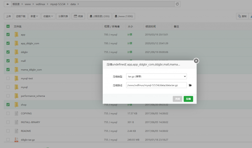 这里进入www/wdlinux/mysql-5.5.54/data将所有的数据库进行压缩,然后复制到阿里云服务器的网站根目录里,方便后面的远程下载。