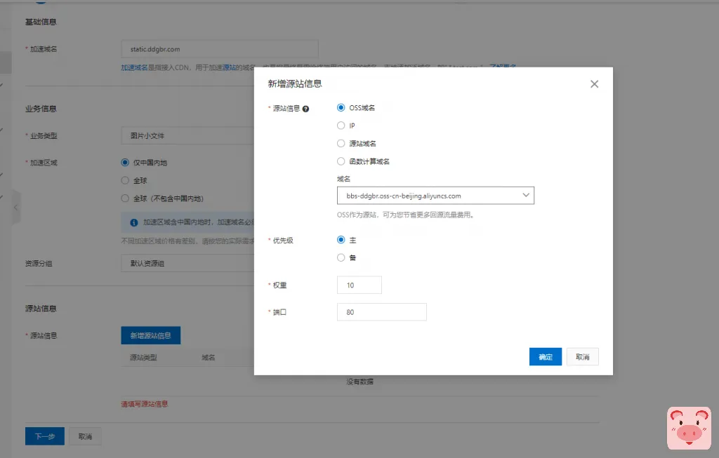 选择新增源站信息,这里添加OSS域名,找到我们创建的bucket域名