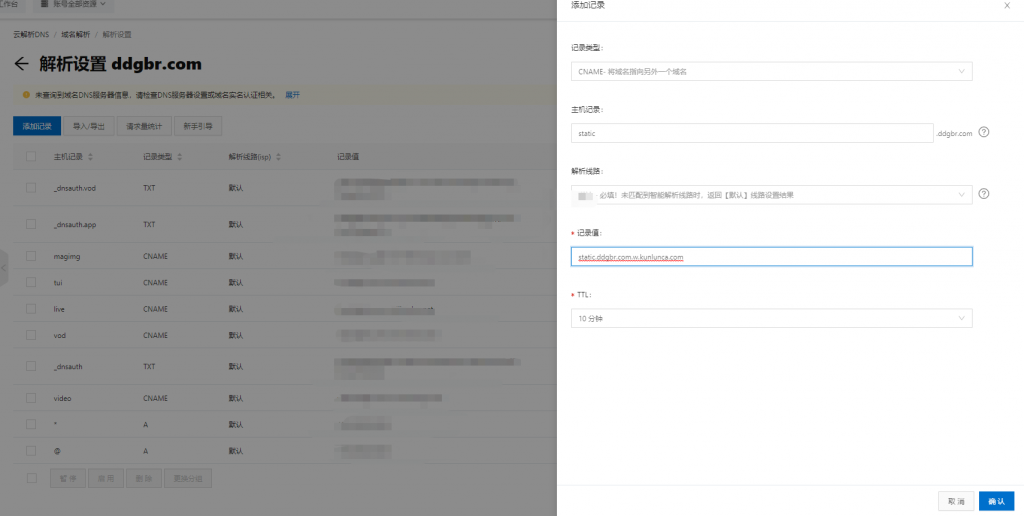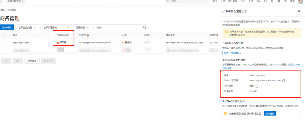 然后进入cdn的域名管理,我们需要按照右侧的要去配置域名的CNAME解析