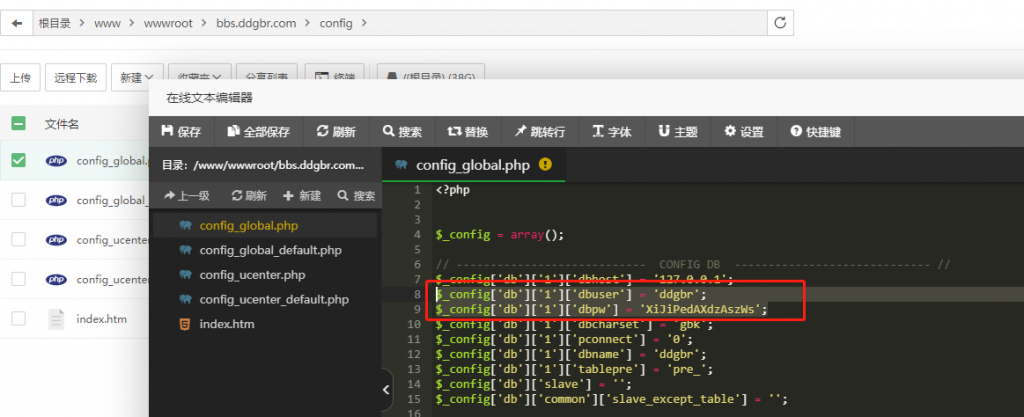 然后分别填入上面的三个文件中对应位置,这里仅以config_global.php举例,其他的文件修改方法一致。