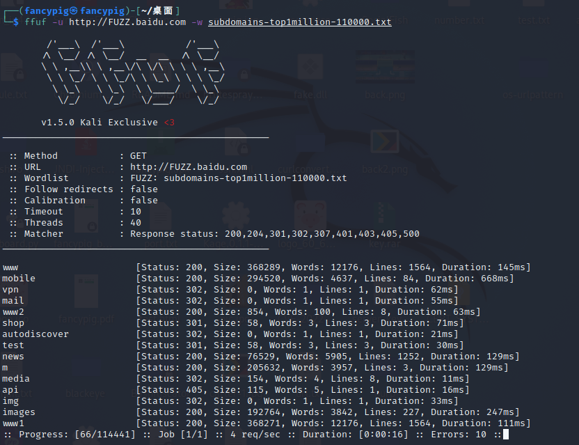 ffuf -u http://FUZZ.baidu.com -w subdomains-top1million-110000.txt