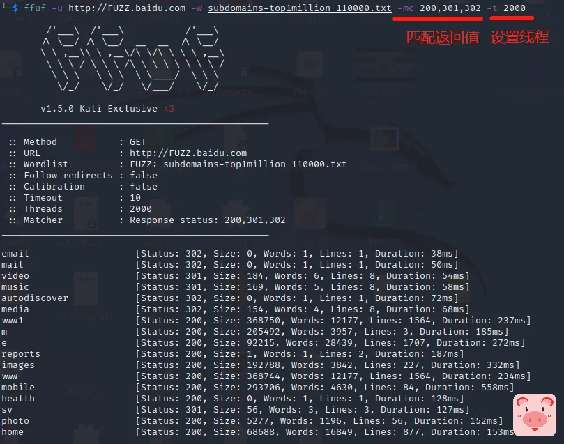 ffuf -u http://FUZZ.baidu.com -w subdomains-top1million-110000.txt -mc 200,301,302