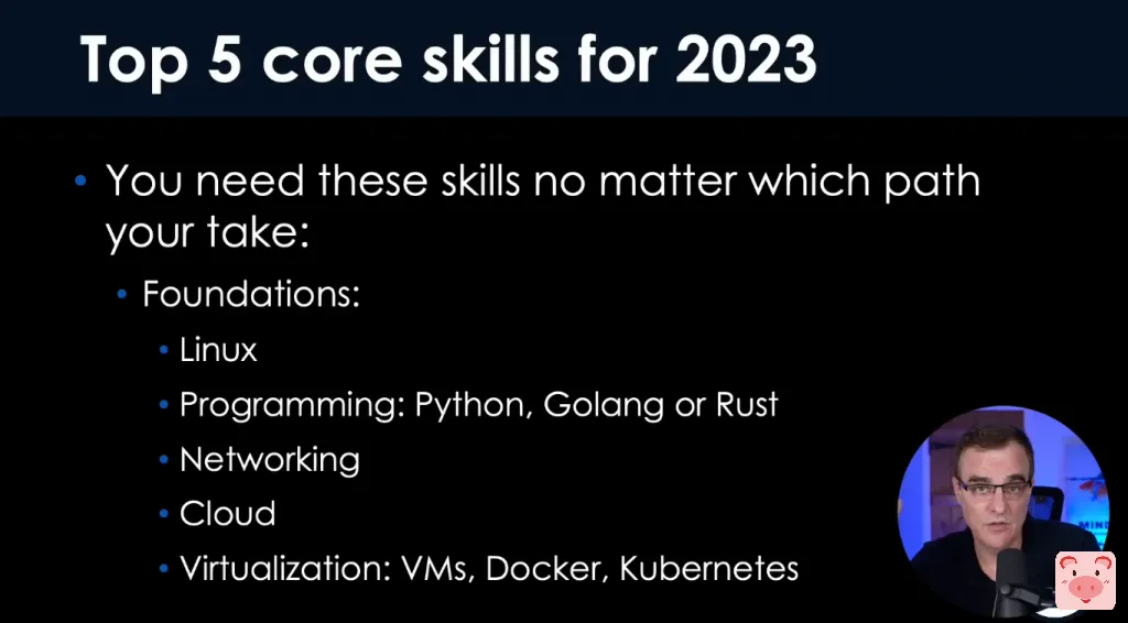 本期视频我们将为大家介绍目前比较火爆的领域,大家可以跟上趋势,譬如数据科学/机器学习/人工智能;开发/编程;网络安全;云端;区块链;API;网络。当然,最核心的5项技能是Linux、编程、网络、云端、虚拟化相关的能力。