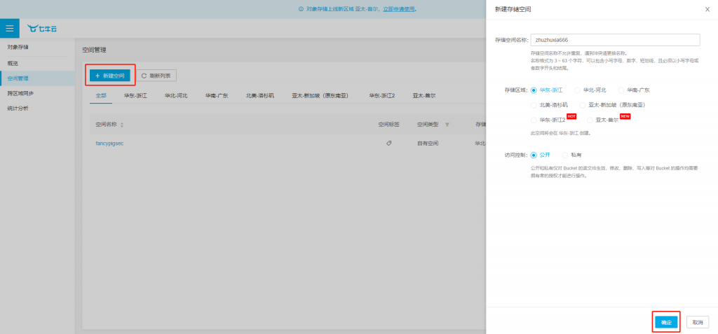 点击空间管理,新建空间,按需填写空间名称,选择合适的存储区域,访问控制选择公开