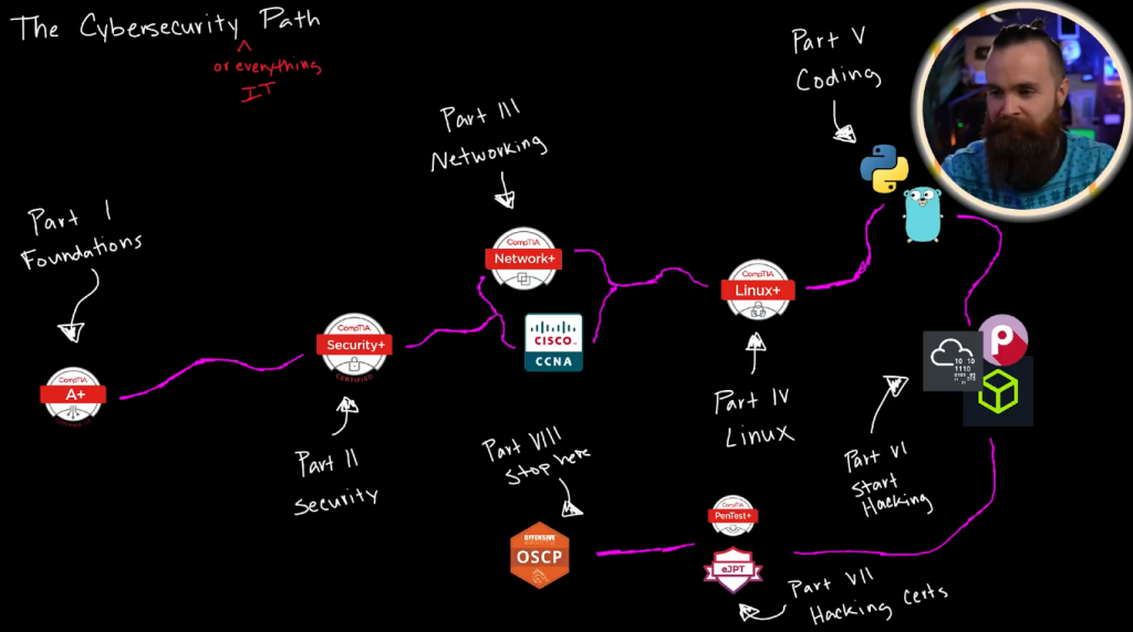 本期视频我们将从8个维度分享黑客技术的学习路径,如何成为一名初级的渗透测试工程师以及最终成为网络安全专家。前5个维度适合每个人,后面3个维度针对想要了解、深入学习黑客技术的比较有帮助。第一是打好基础,譬如别人电脑坏了你可以修吗?你可以从CompTIA A+证书学习开始,它几乎涵盖了IT行业的全部基础知识,移动设备、网络通讯、硬件、虚拟化、云计算、硬件及网络故障的处理。第二个是安全证书,你可以考虑Security+,你可以通过Security+证书的学习过程中了解很多安全术语及安全的基础知识。第三个是网络,网络是必需的技能,你可以考虑学习Network+、CCNA的证书课程。第四个是Linux,可以考虑Linux+的课程学习,但这里需要强调的是证书只是一个敲门砖,如果你给公司实实在在的部署了一台服务器,这个经历将会比Linux+的证书更有价值。第五个是编程,你可以考虑学习一门编程语言,如果没有任何基础可以考虑学习Python,当然有一定基础之后可以学习新兴的语言Golang。第六个是开始学习黑客技术,无论是Pico CTF、TryHackMe、HackTheBox这些训练平台都可以作为渗透测试初学者的学习资源。第七个是黑客相关的证书,你可以考虑Pentest+证书课程或者INE推出的eJPT证书课程。最后一个是OSCP证书,如果你考取了该证书,你会觉得自己像是成为了真正意义上的黑客。OSCP证书是经过攻击性安全认证的专业人士,它告诉全世界您对黑客攻击略知一二。